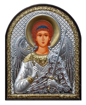 Лицевая часть оклада покрыта серебром повышенной 998 пробы - на окладе имеется клеймо по европейскому стандарту (Lam. Ag). Оклад имеет золотой декор. Лик выполнен масляной краской (шелкография).