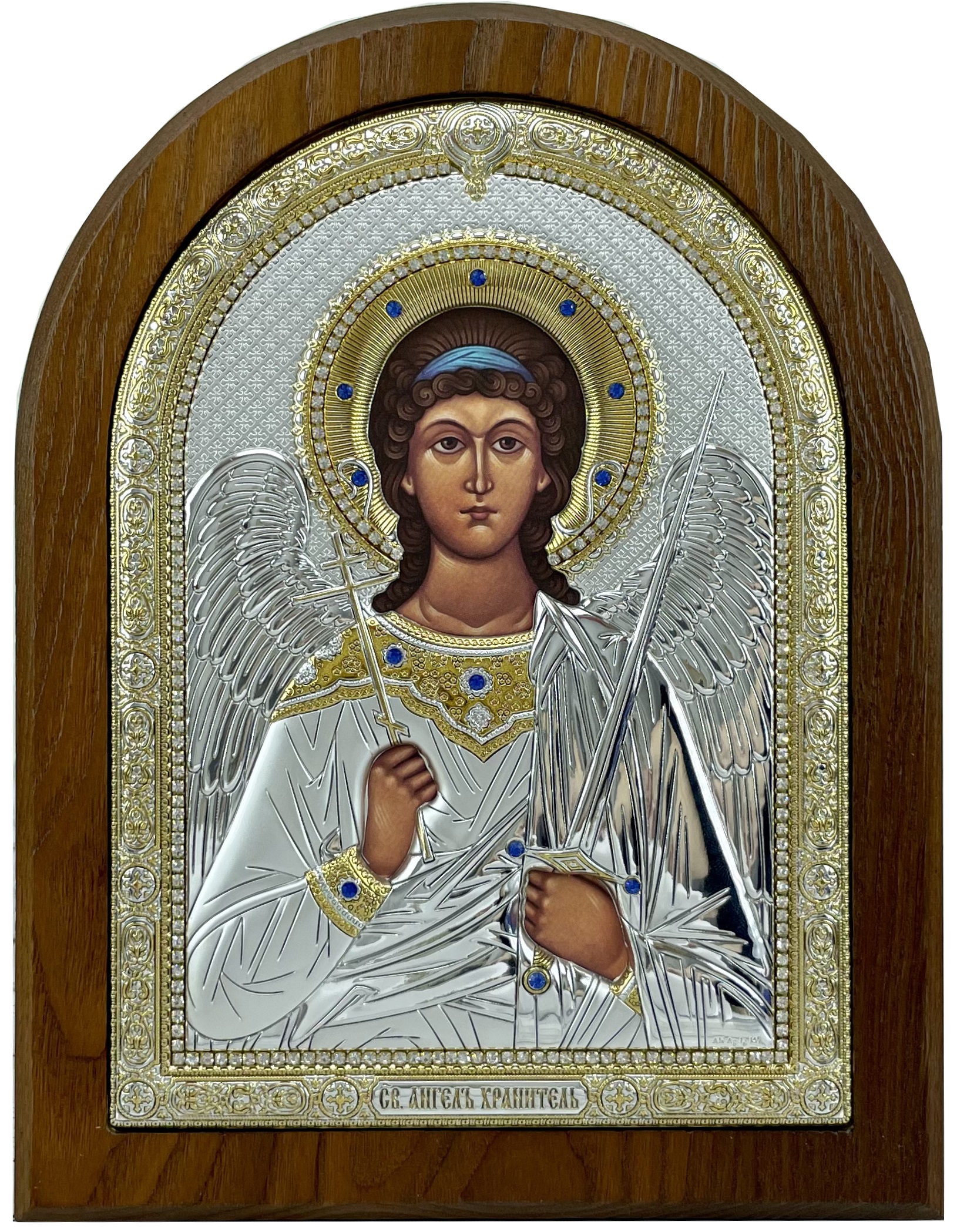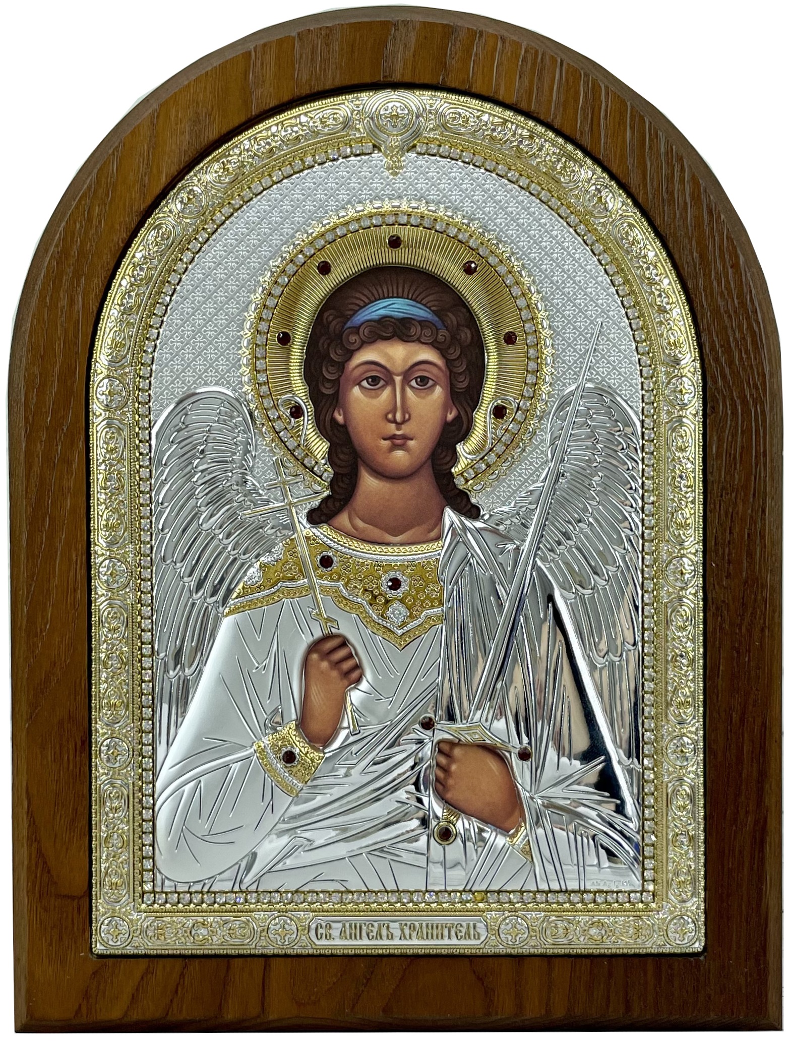Икона Ангел Хранитель. Основа - цельный массив натурального дерева (дуб/ясень). Цвет - коричневый. Основание каждого изделия покрывается натуральным маслом, что обеспечивает гарантию высокого качества и долговечности каждого изделия. Имеет подставку.