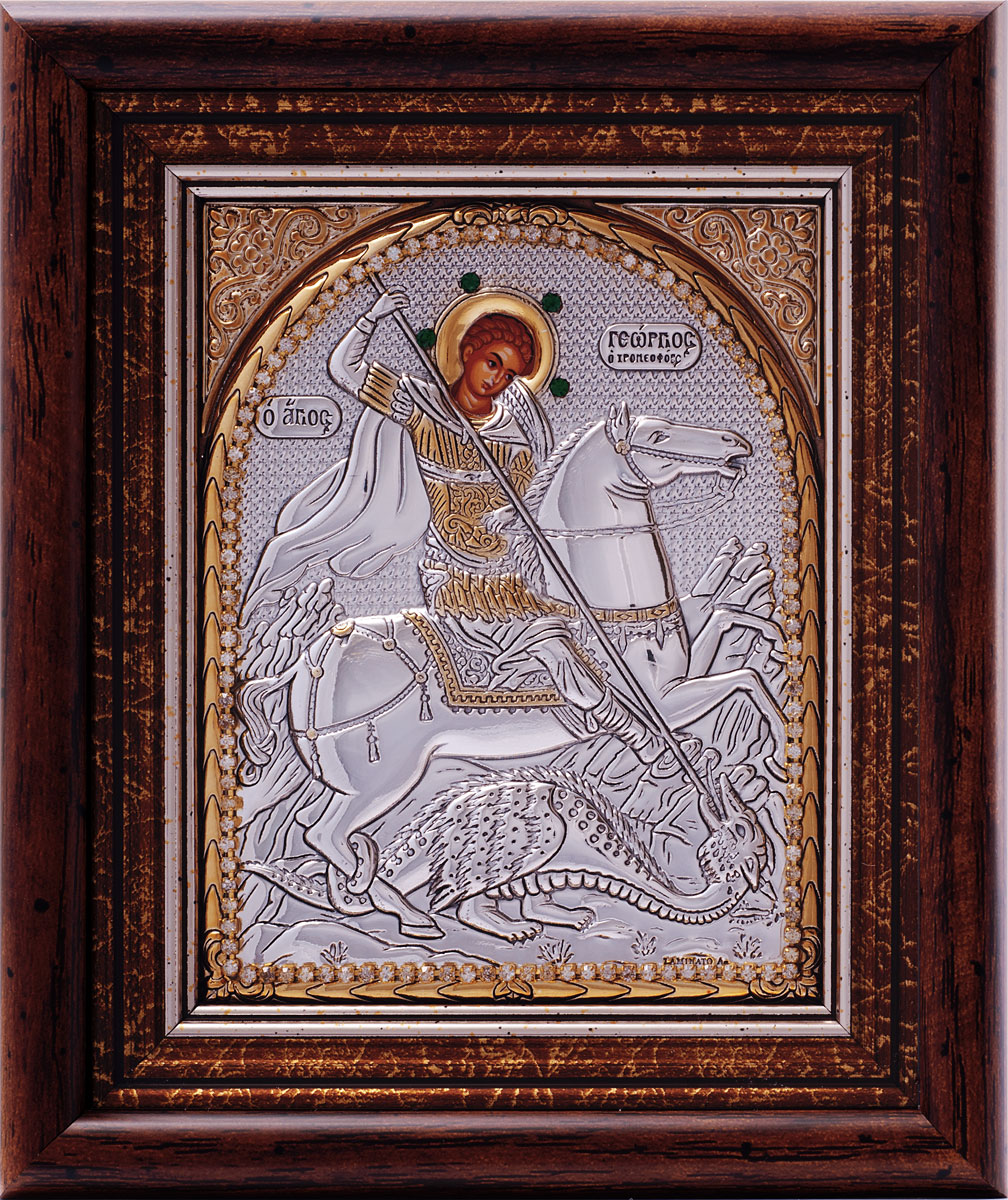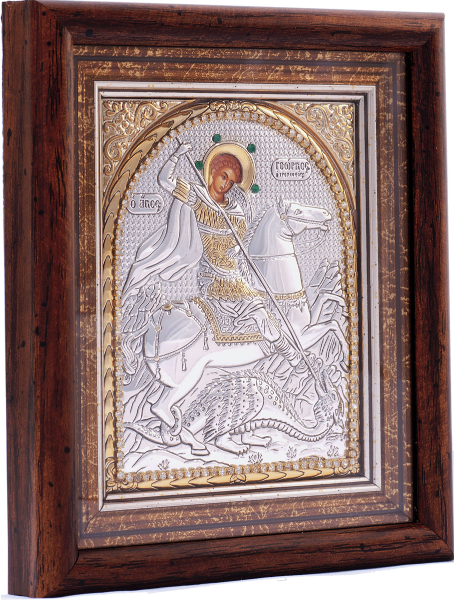 Икона св. Георгий Победоносец в киоте под стеклом. Выполнена на основе из дерева, имеет петлю для подвески.