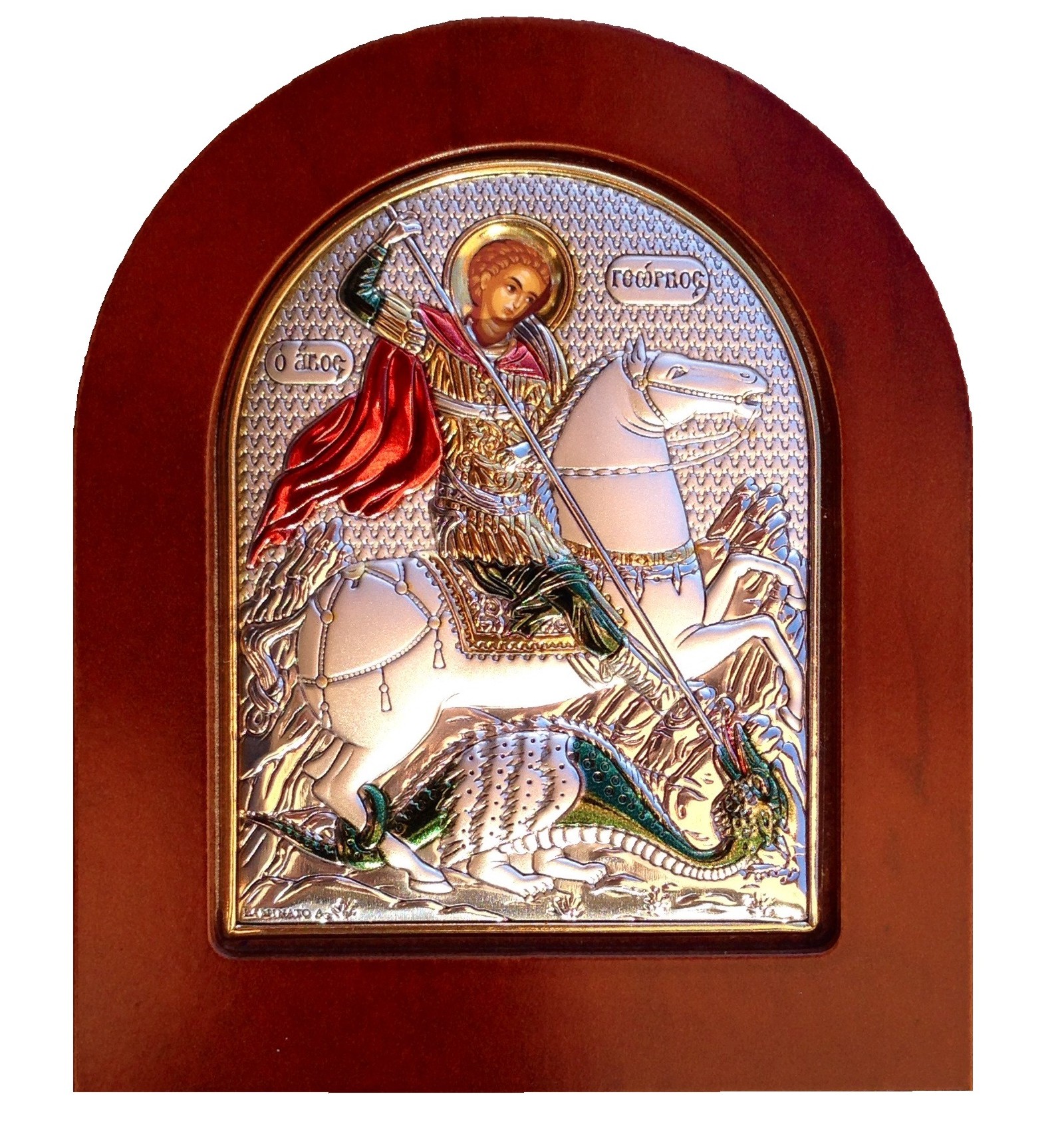 Икона св. Георгий Победоносец. Выполнена на основе из дерева, имеет подставку. Лицевая часть оклада покрыта серебром повышенной 998 пробы - на окладе имеется клеймо по европейскому стандарту (Lam. Ag). Оклад имеет золотой декор, покрытие цветным лаком. Лик выполнен масляной краской (шелкография). Поставляется в подарочной упаковке.