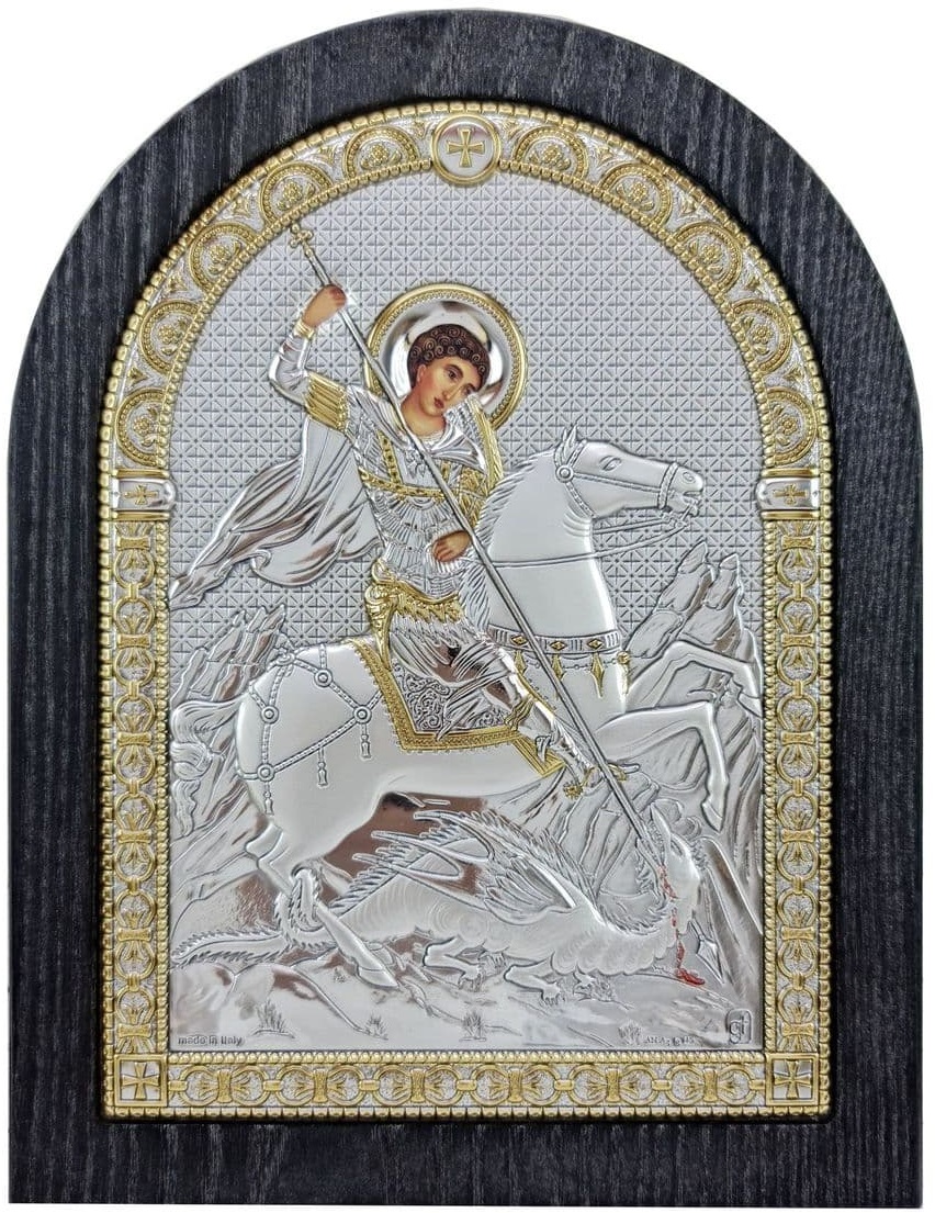 Икона св. Георгий Победоносец. Основа - цельный массив натурального дерева (дуб/ясень). Цвет - черный. Основание каждого изделия покрывается натуральным маслом, что обеспечивает гарантию высокого качества и долговечности каждого изделия. Имеет подставку.