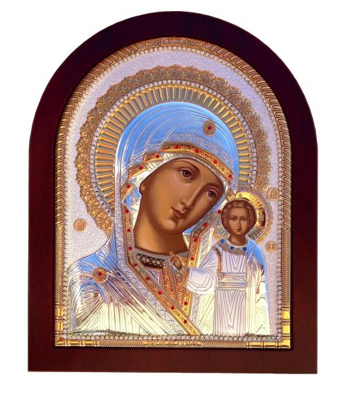 Лицевая часть оклада покрыта серебром повышенной 998 пробы - на окладе имеется клеймо по европейскому стандарту (Lam. Ag). Оклад имеет золотой декор, украшен множеством камней. Лик выполнен масляной краской (шелкография).