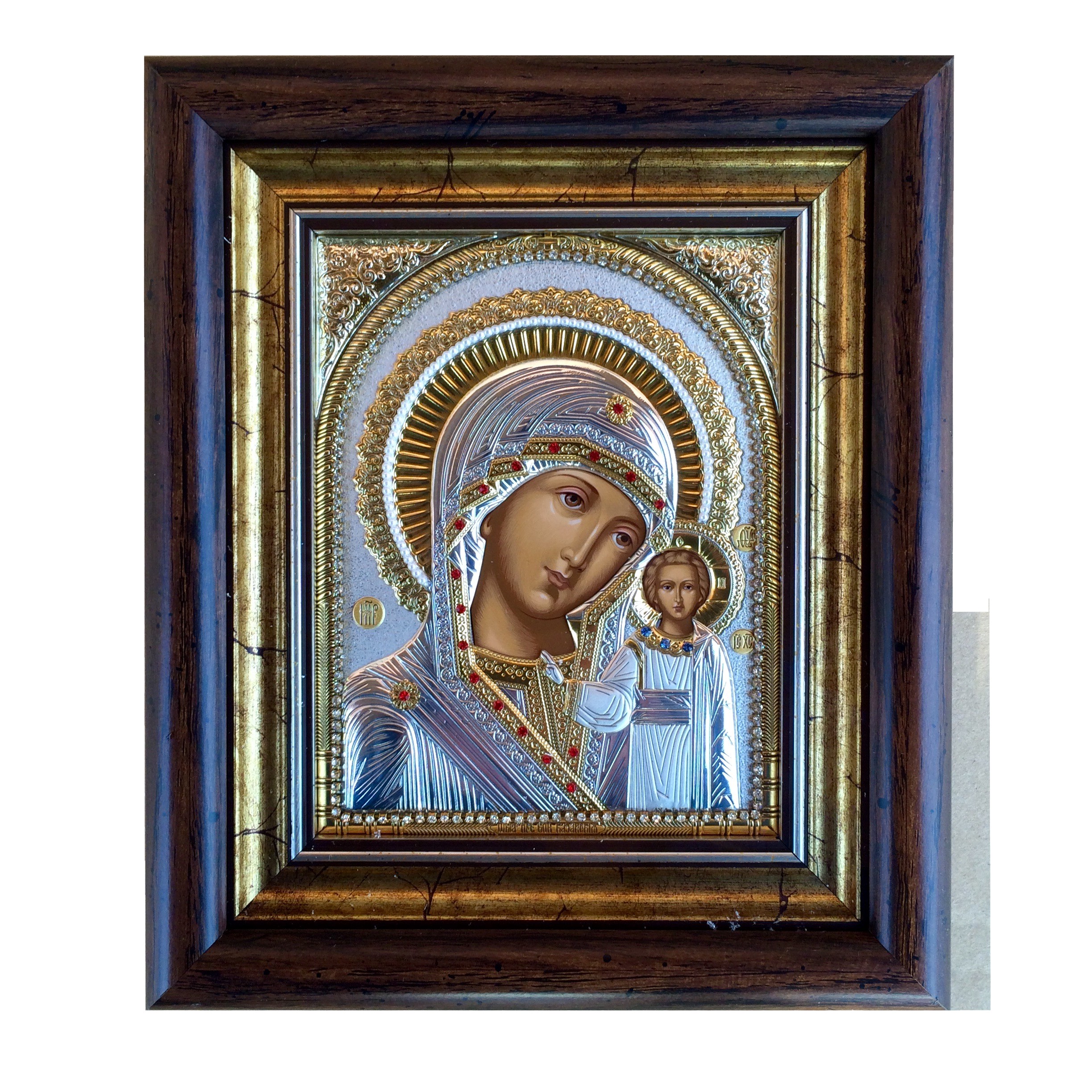 Икона Божьей Матери Казанская в киоте под стеклом. Выполнена на основе из дерева, имеет петлю для подвески.