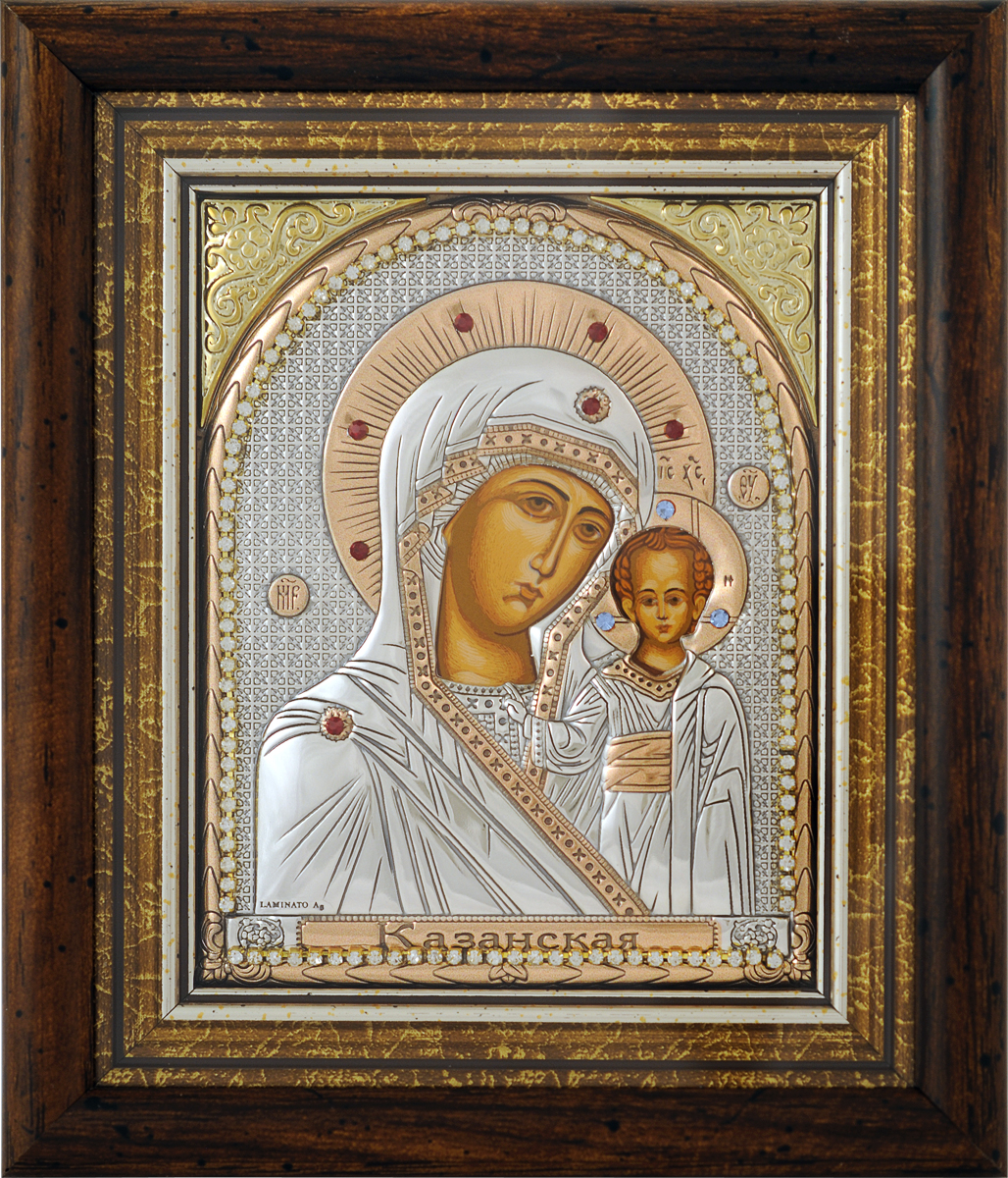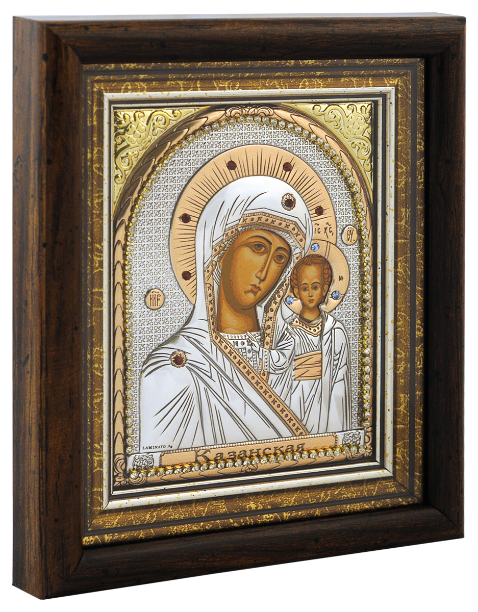 Лицевая часть оклада покрыта серебром повышенной 998 пробы - на окладе имеется клеймо по европейскому стандарту (Lam. Ag). Оклад имеет золотой декор, украшен множеством камней. Лик выполнен масляной краской (шелкография). Рамка стилизована под старину.