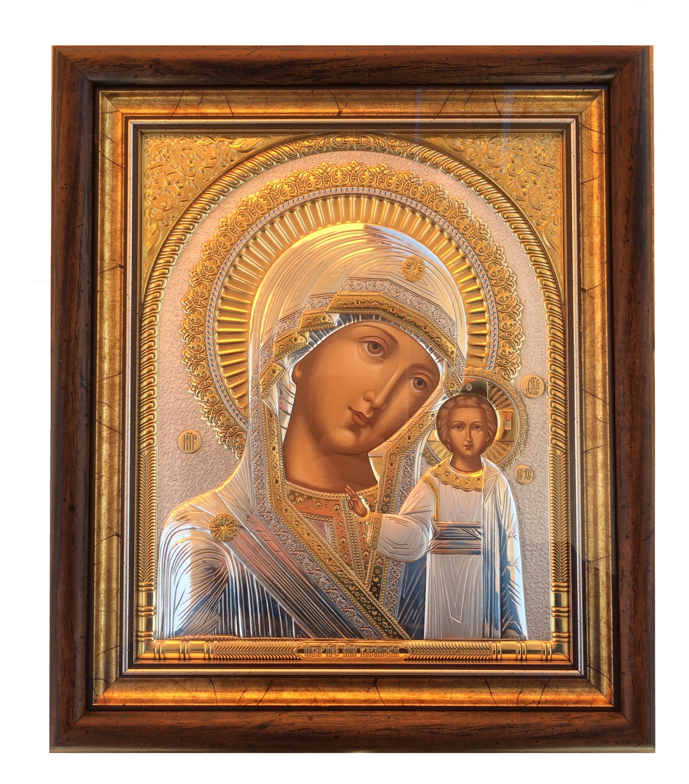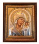Икона Божьей Матери Казанская в киоте под стеклом. Выполнена на основе из дерева, имеет петлю для подвески.
