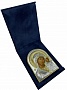 Лицевая часть оклада покрыта серебром повышенной 998 пробы - на окладе имеется клеймо по европейскому стандарту (Lam. Ag). Оклад имеет золотой декор. Лик выполнен масляной краской (шелкография).