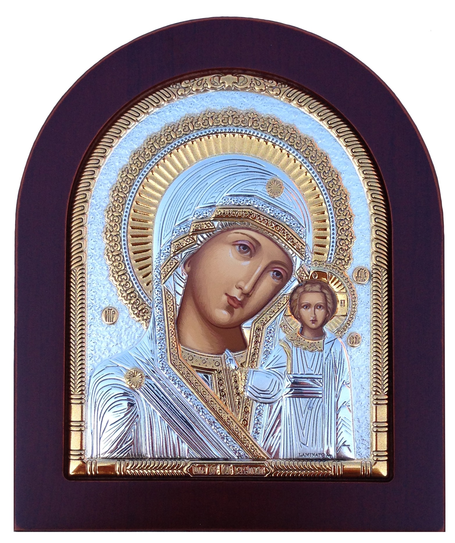 Лицевая часть оклада покрыта серебром повышенной 998 пробы - на окладе имеется клеймо по европейскому стандарту (Lam. Ag). Оклад имеет золотой декор. Лик выполнен масляной краской (шелкография).