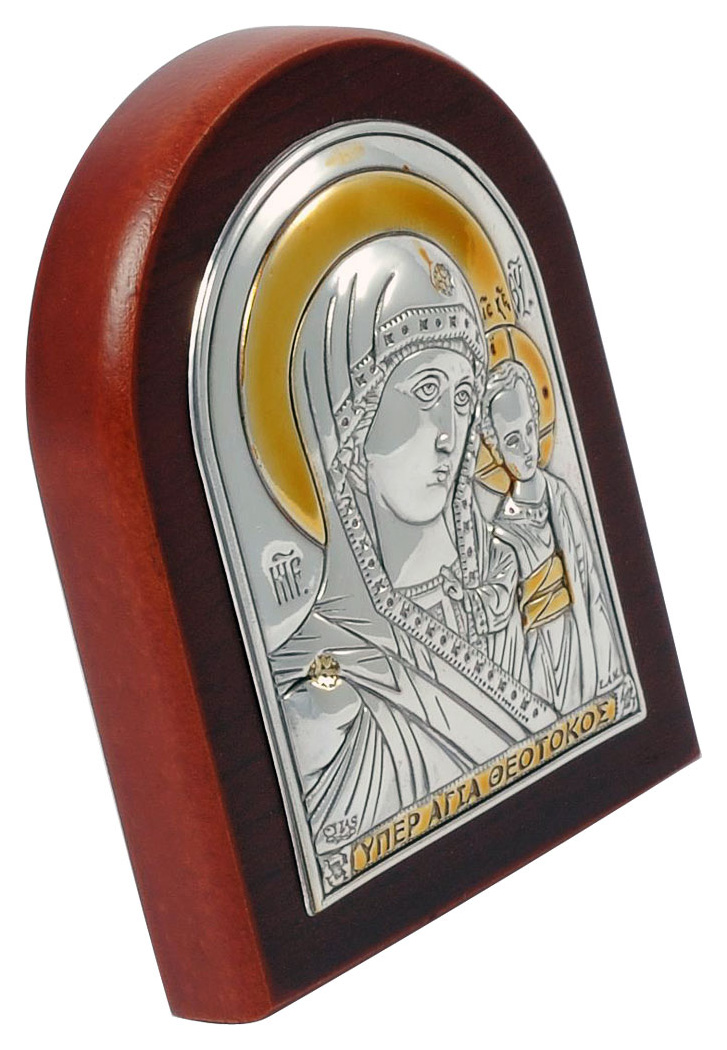 Лицевая часть оклада покрыта серебром повышенной 998 пробы - на окладе имеется клеймо по европейскому стандарту (Lam. Ag). Закрытый лик. Золотой декор.