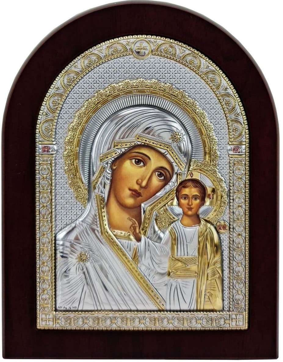 Лицевая часть оклада покрыта серебром повышенной 998 пробы - на окладе имеется клеймо по европейскому стандарту (Lam. Ag). Оклад имеет золотой декор. Фото-печать.