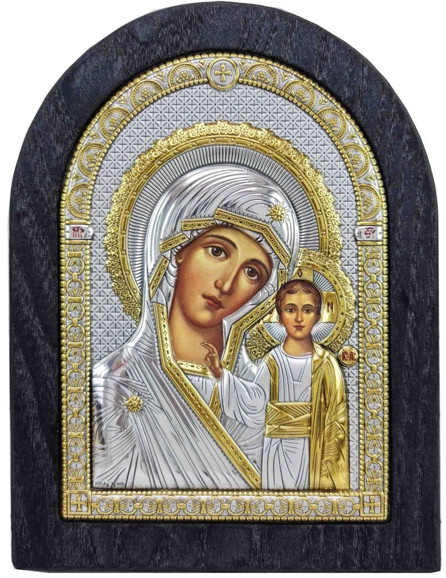 Икона Божьей Матери Казанская. Основа - цельный массив натурального дерева (дуб/ясень). Цвет - черный. Основание каждого изделия покрывается натуральным маслом, что обеспечивает гарантию высокого качества и долговечности каждого изделия. Имеет подставку.