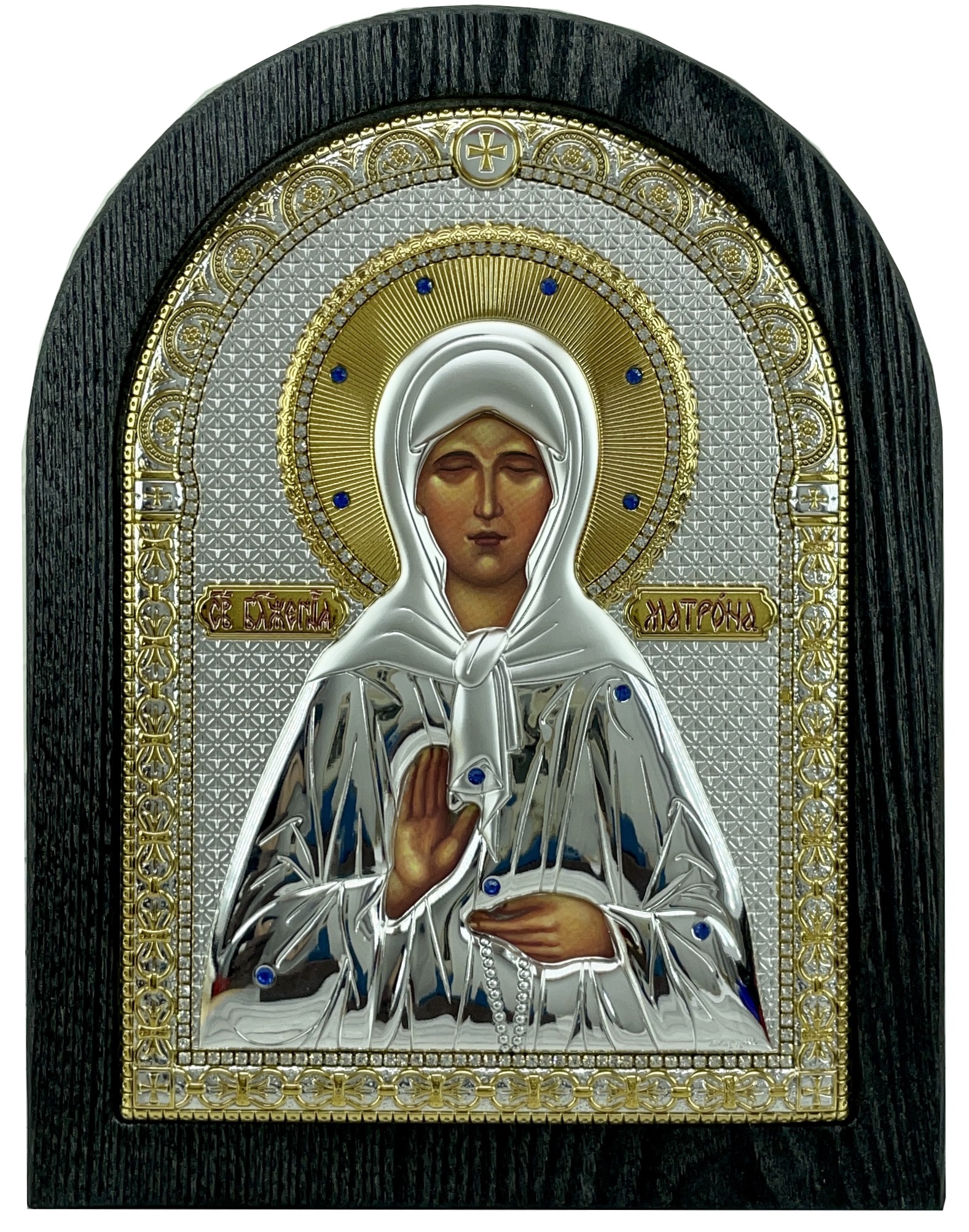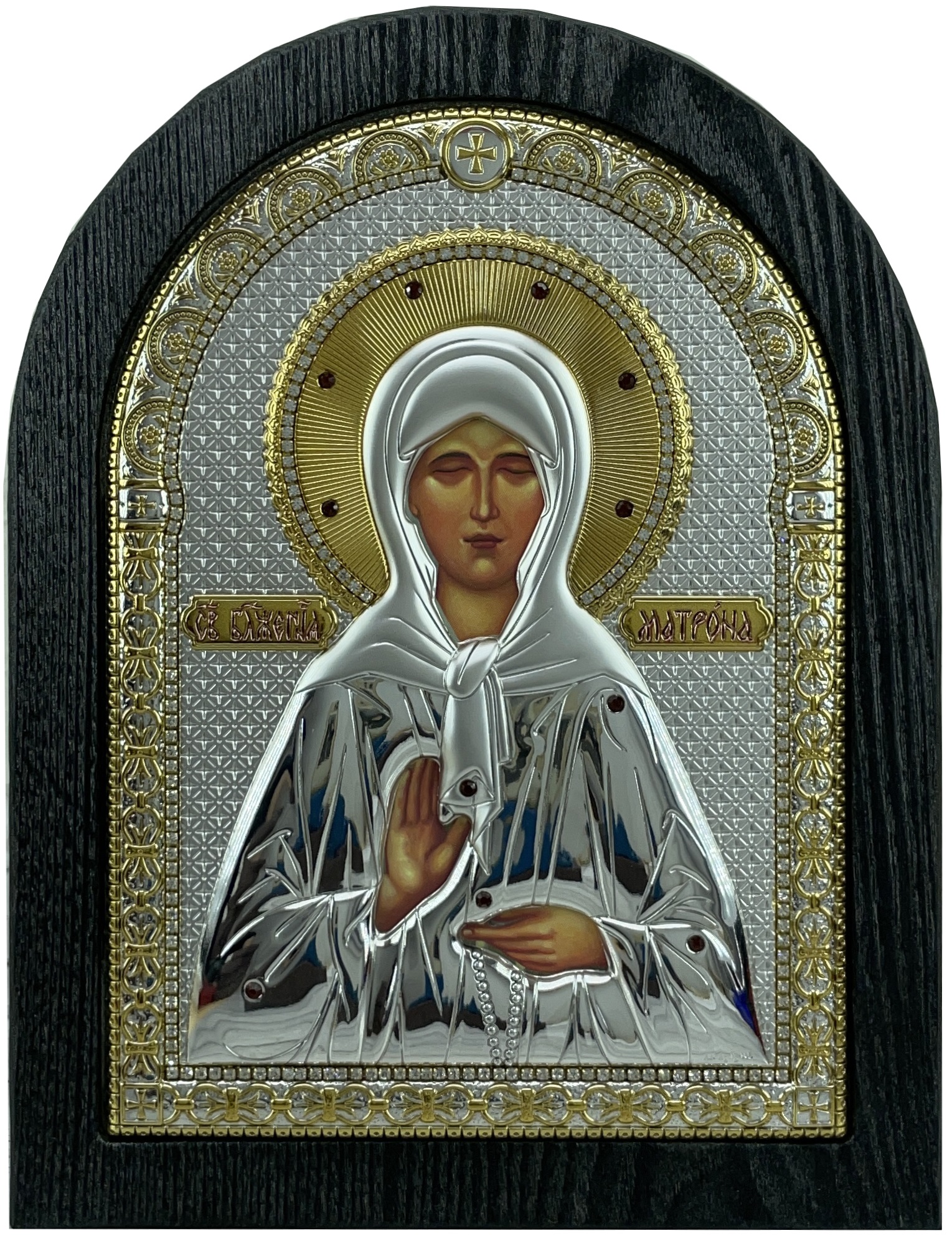 Икона св. Блаженная Матрона. Основа - цельный массив натурального дерева (дуб/ясень). Цвет - черный. Основание каждого изделия покрывается натуральным маслом, что обеспечивает гарантию высокого качества и долговечности каждого изделия. Имеет подставку.