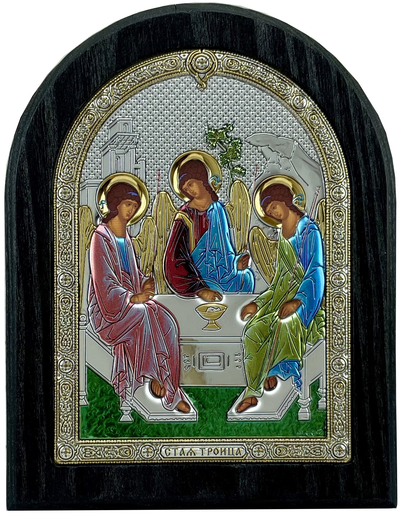 Икона Святая Троица. Основа - цельный массив натурального дерева (дуб/ясень). Цвет - черный. Основание каждого изделия покрывается натуральным маслом, что обеспечивает гарантию высокого качества и долговечности каждого изделия. Имеет подставку.